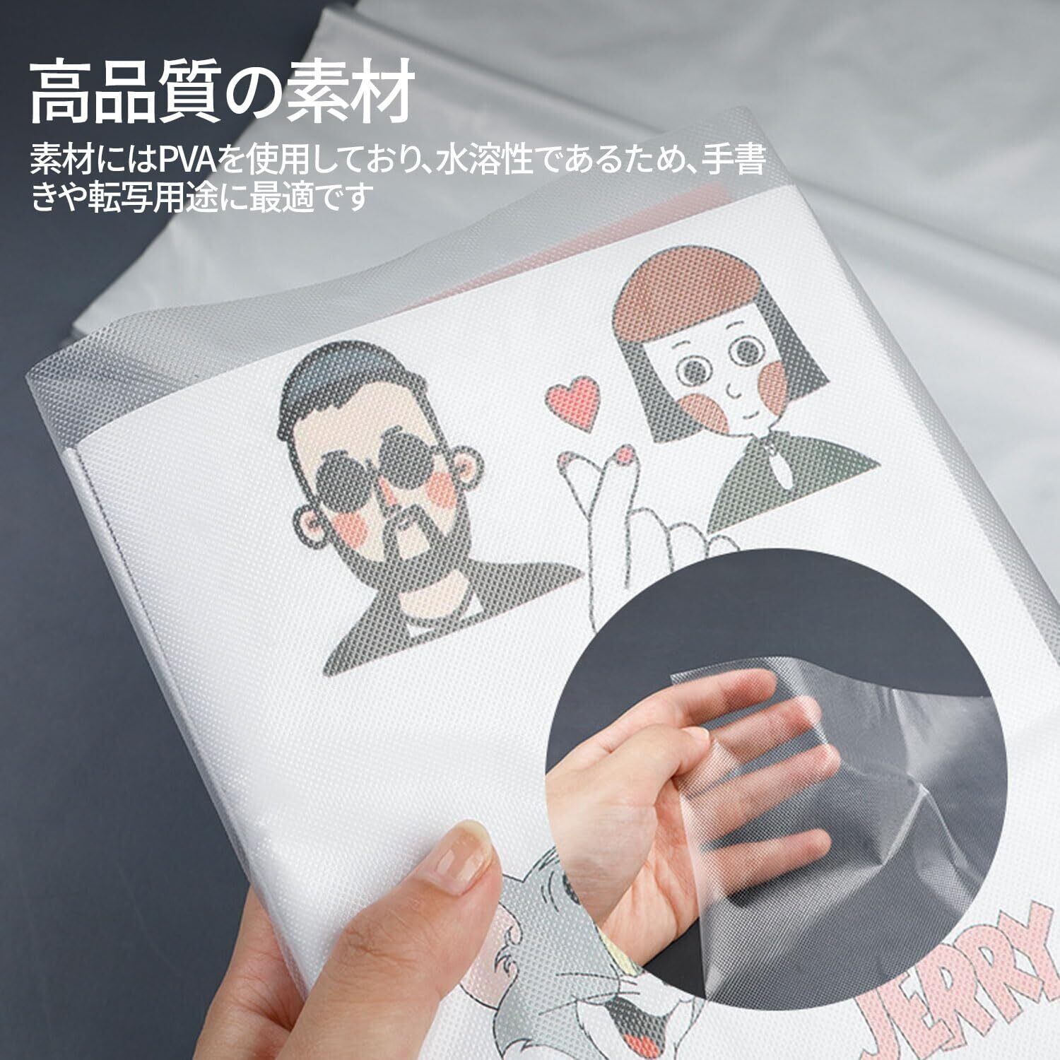 ️【お取扱いについて】水性のシートです。少しの水滴や水分があると溶けてしまいますので、作業中や保管には水分に触れないように気をつけて下さい。刺繍などでご使用になる際は、水性ペンをご利用下さい。ペンによってはインクをはじいてしまう場合もございます。試し書きを行ってからご利用下さい。手書き・転写用です。プリンタの印刷ではご利用できません。こちらはシールタイプではございません。凸凹したエンボス加工が裏面と表示がありますが、エンボス加工の面を表にしてもご使用いただけます。お好みで使い下さい。インク過多の場合は、水洗いをした場合に溶け残りが起こる場合がございます。ペンで塗り潰すようなデザインは避け、線で描くようにお使い下さい。シールが溶けきれなく生地に残ってしまった場合、生地の風合いが変わる場合がございます。また、生地によっては、シート残りが生地表面に見えることがございますので、しっかりと洗い流して下さい。
