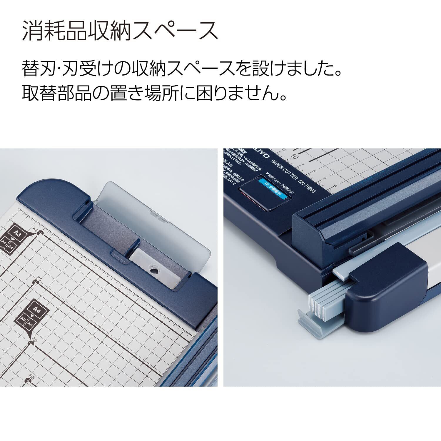 ■■シンプルな構造で手早く作業できる、少枚数カットに便利な10枚用ペーパーカッター■■・チタン加工刃搭載で、切れ味持続2倍・切れ味110%・刃先の硬度2.5倍(すべて当社比。チタン加工あり・なしの場合で比較)・スライダーを前後にスライドするだけで、簡単に裁断ができるロータリー式ペーパーカッター(裁断能力:PPC用紙10枚)・コーナー目印つきなので、半分カットも定型カットも手早く位置合わせできます。・盤面の目盛りは見やすいウェーブ目盛りを採用。・本体に替刃・刃受けの収納ケースをがあり、取替部品の置き場所に困りません。・刃は、丸刃とミシン目刃が使用でき、用途に応じて使い分けができます。・替刃(丸刃・ミシン目刃)、交換用の刃受けを別売で用意しています。商品仕様・サイズ/A4・外寸法/W282×D402×H75mm・重量/1.3㎏・裁断能力(約1往復裁断)/PPC用紙10枚※・材質/金属部:鋼板、樹脂部:ABS・POM・付属品/丸刃1枚(本体セット済み)・刃受け1枚(本体セット済み)・丸刃収納用空ケース1個・ミシン目刃は、PPC用紙3枚以下でご使用ください。※裁断表示能力は、PPC用紙64g/m2を使用時の数値です。再生紙の場合はセットできる枚数が若干少なくなったり、必要な往復回数が増えることがありますのでご注意ください。※紙押さえロック機構はついていません。