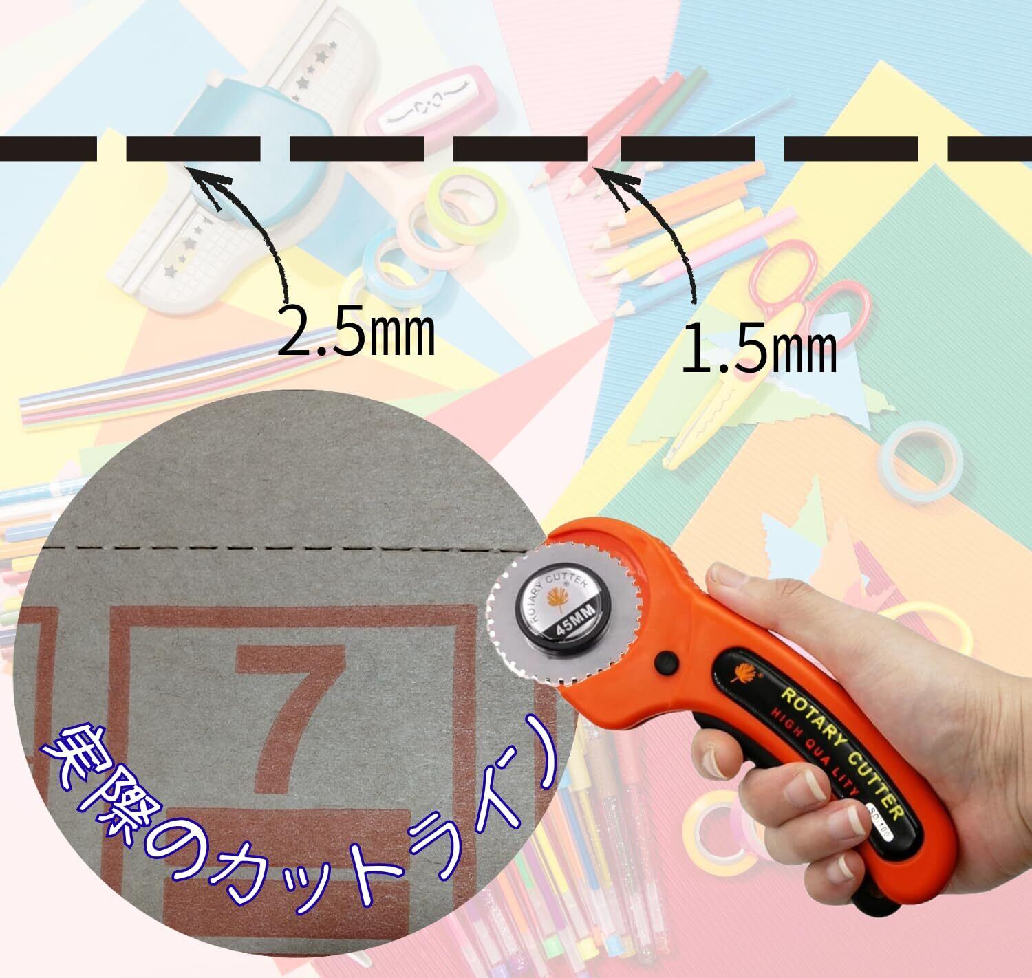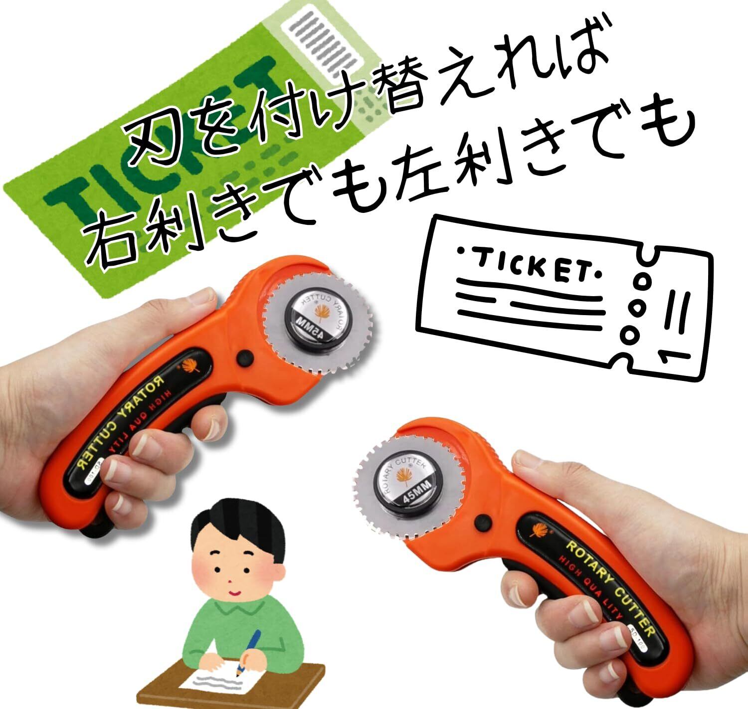 45mmロータリー式ミシン目カッターは、紙や布に美しい切り取り線を入れられる裁断ツールです。チケットやクーポン作成、ハンドメイド作品、裁縫、クラフト工作など、幅広いシーンで活躍します。