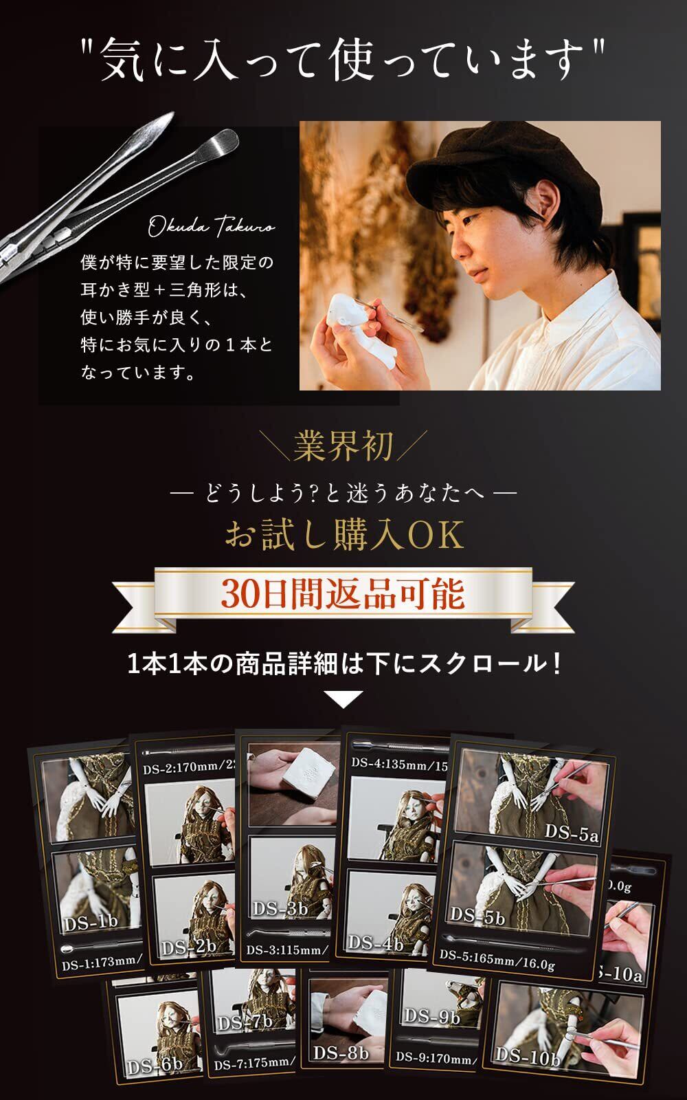 【開発期間・たくさんの苦労を乗り超え実現した集大成モデル】 あの有名映画の「バロン」を制作した奥田さんが厳選。目的が不明瞭なスパチュラセットが溢れる中で、本当に必要な形状を厳選し、 世にない形状は1年をかけて0から開発。独自形状モデルのDS2は今では奥田さんの愛用モデルとなっています。