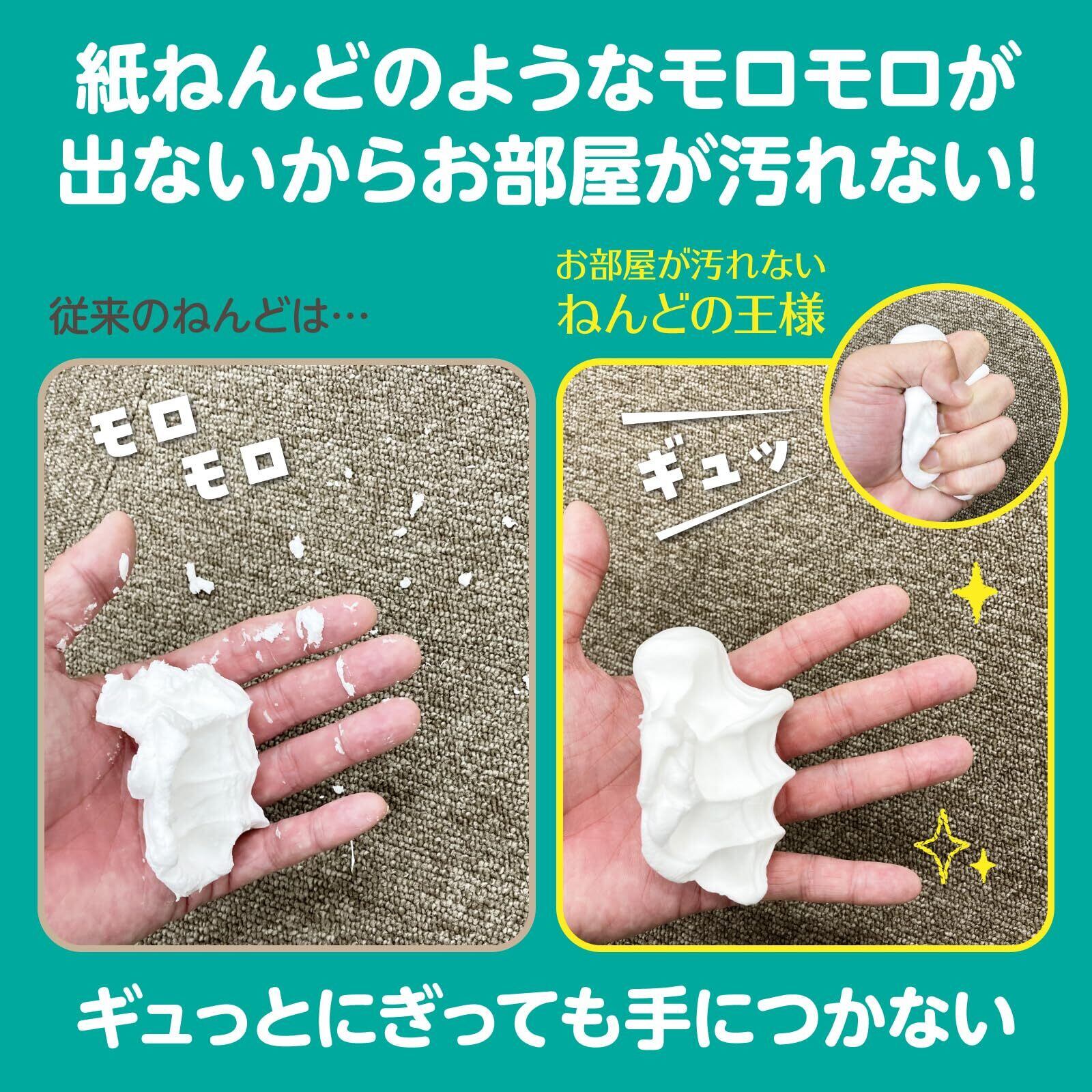 乾燥してもひび割れしない! 一般的なねんどは乾燥時に収縮・変形しますが、ねんどの王様は変形しにくく、時間がたってもひび割れしないので、作った形を維持でき、制作した作品をいつまでも美しく保存できます。燥した粘土にもよくつく!ねんどどうしが吸い付くようによくつくので、作品づくりが楽々!細かな表現も手間取らない!乾燥した粘土にもよくなじみます。