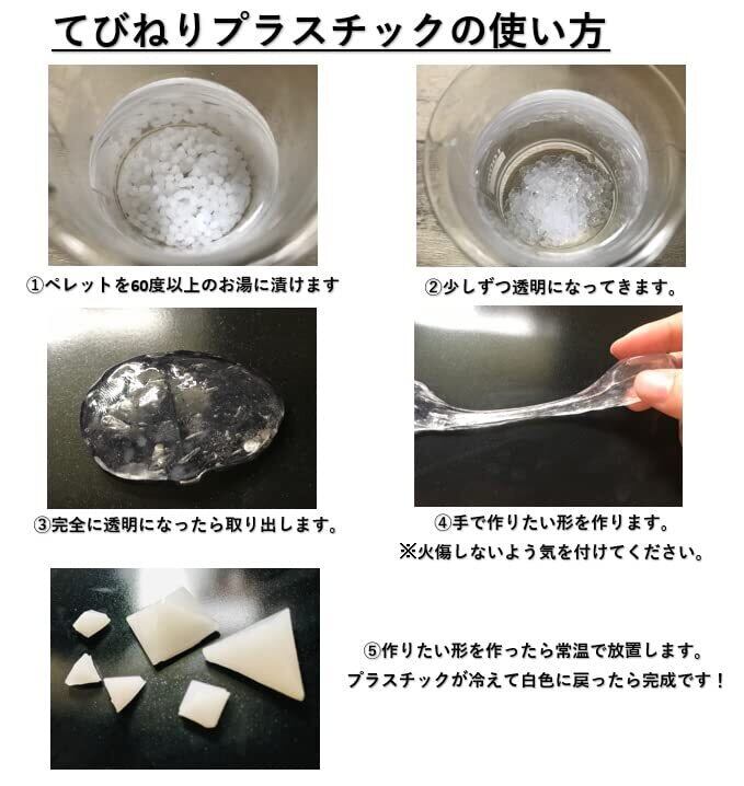 【手びねりプラスチックの使用方法】 1. プラスチック以外の容器に本製品を入れ60度以上のお湯を注ぐ。 2. 色が透明になったら火傷に注意して取り出します。 3. 好きな形にして冷ませば固まります。形が決まったら、水に入れて冷やすと形が崩れず、すぐに固まります。 4. 造形後もドライヤーで温めることで、パーツ同士の接着や部分的な微調整が可能です。