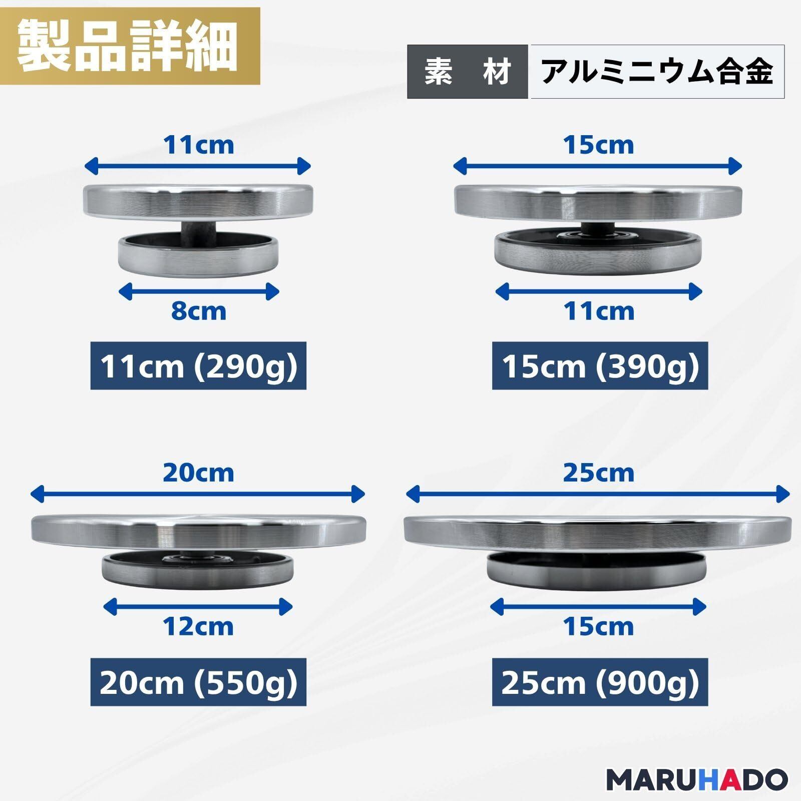 【商品内容】本体x1 【材質】アルミニウム合金 【サイズ】直径11cm(裏面8cm)、直径15cm(裏面11cm)、直径20cm(裏面12cm)、直径25cm(裏面15cm) 【注意点】※製造過程で生じた多少のバリが残っている場合がございます。 ※製造個体によってベアリングがスムーズでなかったり異音がある場合はご連絡ください。保証期間内で責任を持ってご対応させていただきます。