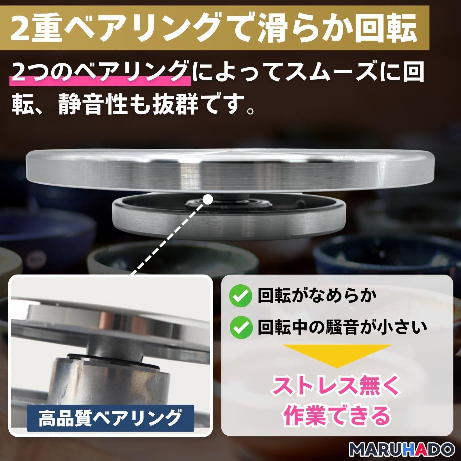 【滑らかな回転】高品質な2つのベアリングを採用した手回しろくろなので、ブレなくスムーズに回転してくれます。2重ベアリングによって滑らかで長時間の回転を実現しました。陶芸の成形や絵付け、粘土細工やフィギュア塗装も快適に進められ、静音性もあるためご自宅や教室でも安心してご使用いただけます。