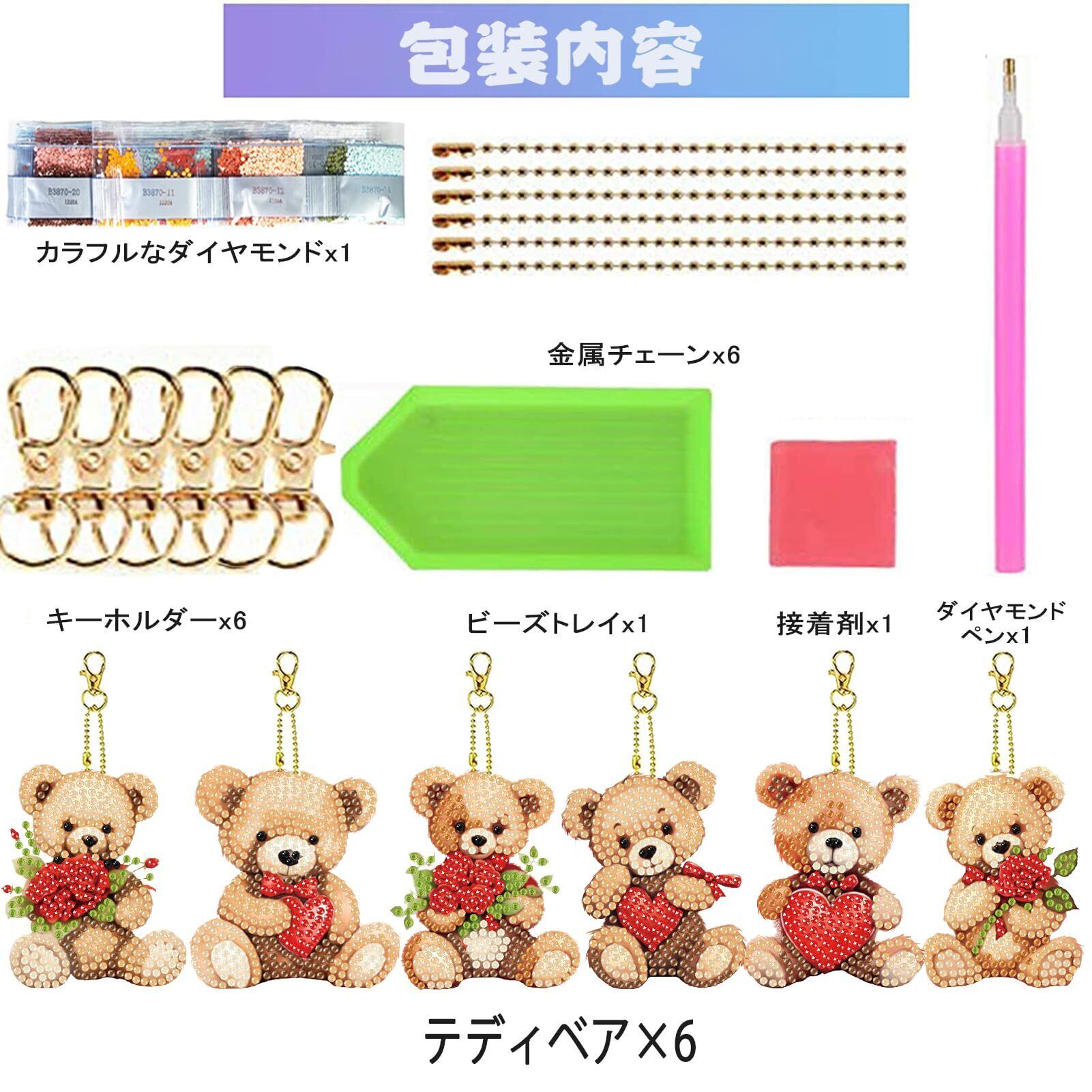 【パッケージ内容】高品質樹脂 テディベアx6、金属チェーンx6、キーホルダーx6、カラフルなダイヤモンドx1、ビーズトレイx1、ダイヤモンドペンx1、接着剤