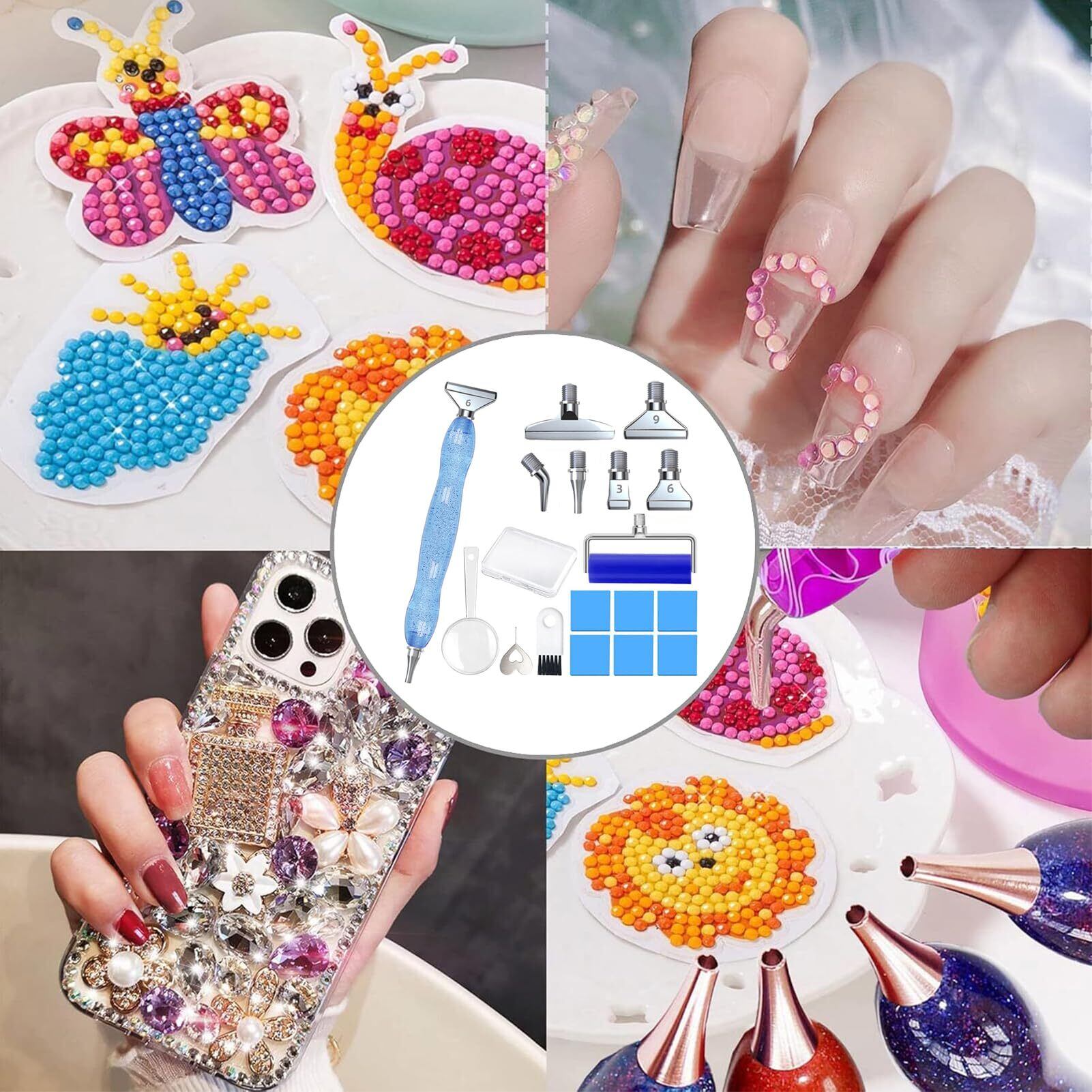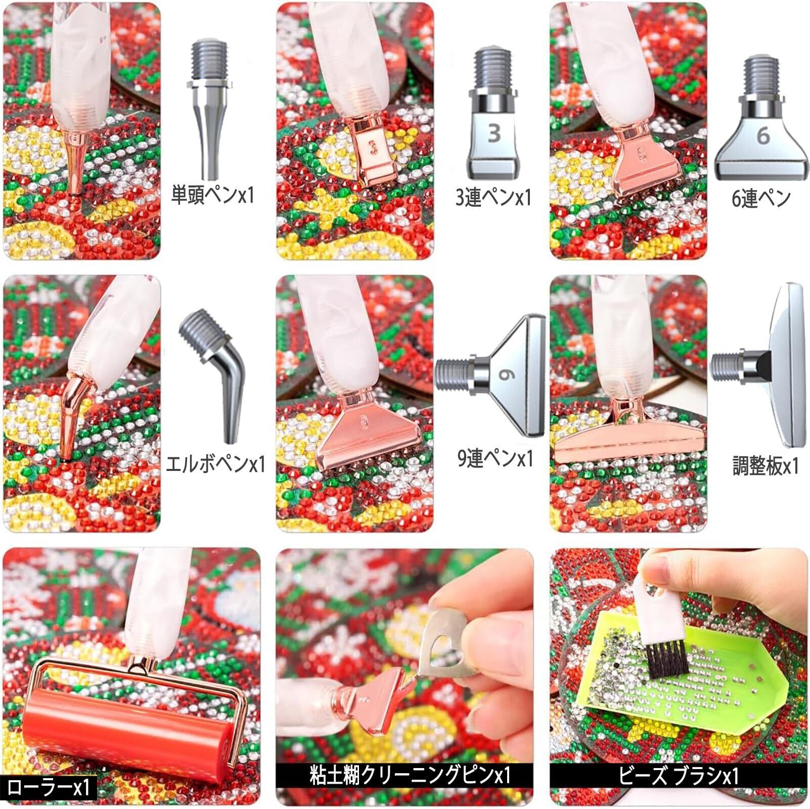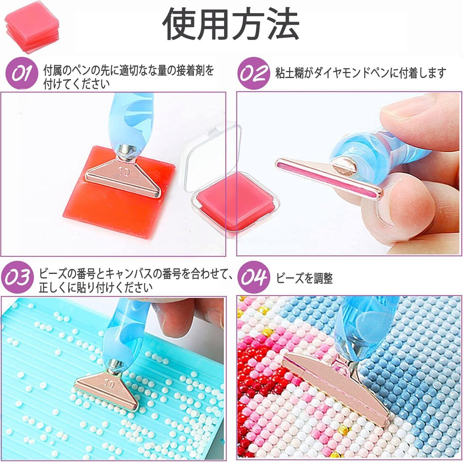 【ダイヤモンドアート ペン キット パッケージ内容】ダイヤモンドペン本体x1本、金属ペン先x5本(エルボペン+単頭ペン+3連ペン+6連ペン+9連ペン)、金属調整板x1個、粘土糊x6個(2x2cm)、ビーズローラーx個、粘土糊クリーンアップピンx1個、ビーズブラシx1個、拡大鏡x1個、収納ボックスx1個を含むる。