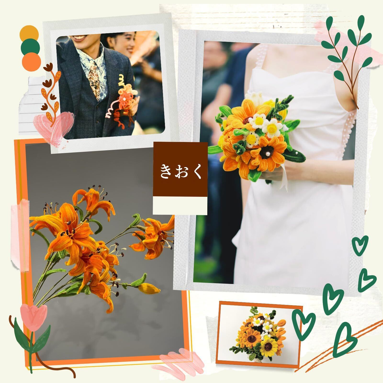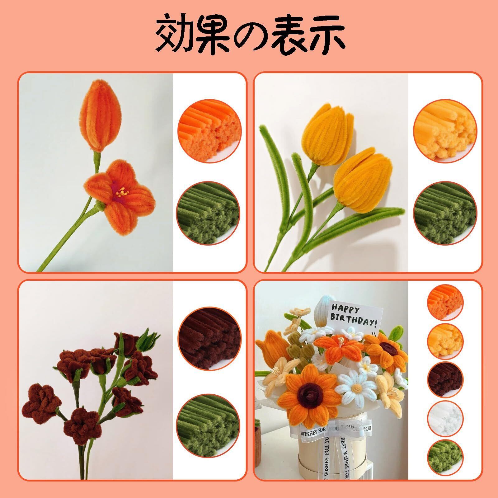 【商品仕様】モール*約250本(6mm*30cm),ビニルコーティングワイヤー*20本(2mm*30cm),フローラテープ 1巻(長さ約27m*幅12mm),双頭花おしべ*約150本。