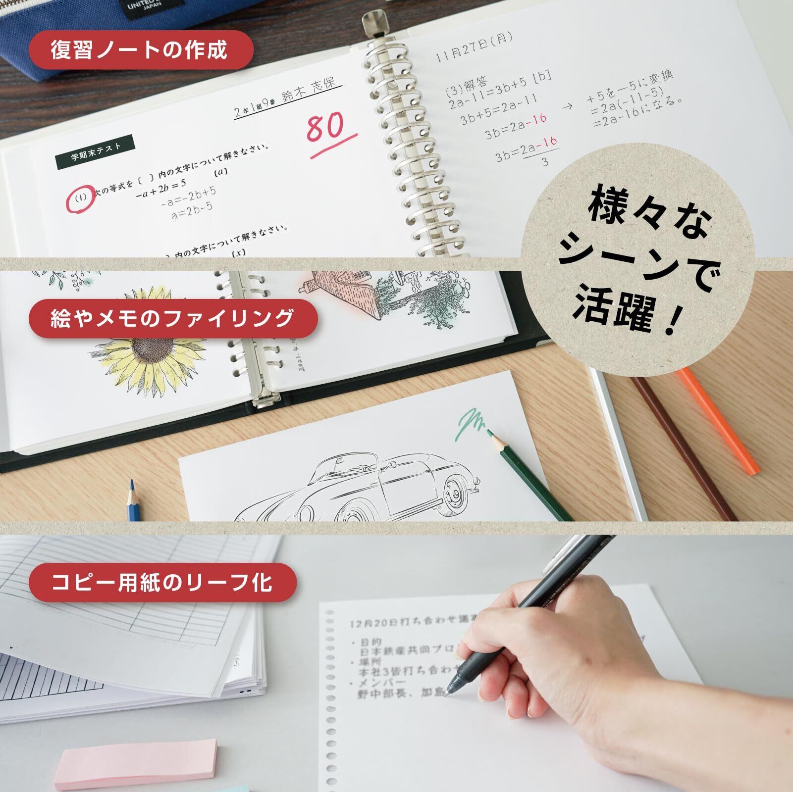【対応サイズ】A4/30穴,B5/26穴,A5/20穴【穿孔枚数】5枚【穴径】5.5mm 【穴間隔】9.5mm