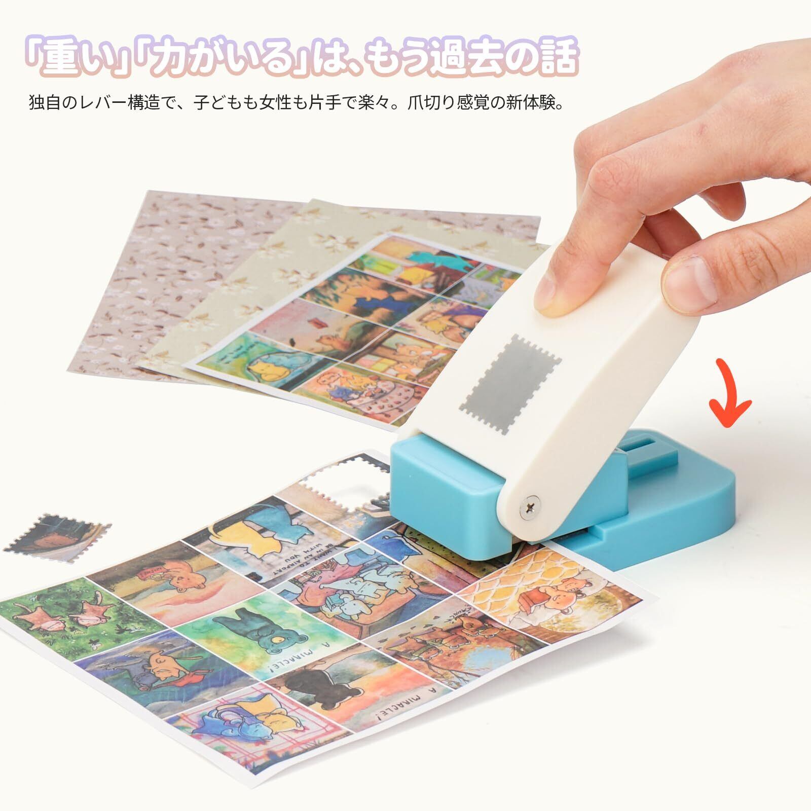 1. ️【切手風デザイン・省力レバー式なクラフトパンチ】 郵便切手をモチーフにしたクラフトパンチ。独自のレバー構造により、サクっと軽い力で押すだけで、約2.5×2.1cmのピンとした美しい長方形を紙に一度で打ち抜けます。操作は非常に簡単で、子どもから大人までストレスなくご使用いただけます。