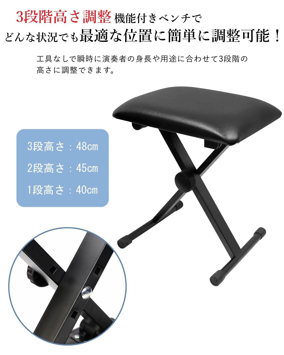 【キーボートベンチ】3段階高さを調整可能。身長や用途に応じて40~48cmの間で3段階調整できます。PUレザー生地の表面で、40mm厚さのクッション付き、柔らかくて滑らかな触感でありながら、長時間の演奏でも快適な座り心地を提供できます。片側を開くだけでフックに固定して簡単に設置でき、収納もコンパクトで場所を取らず、使わないときもすっきりと片付けられます。