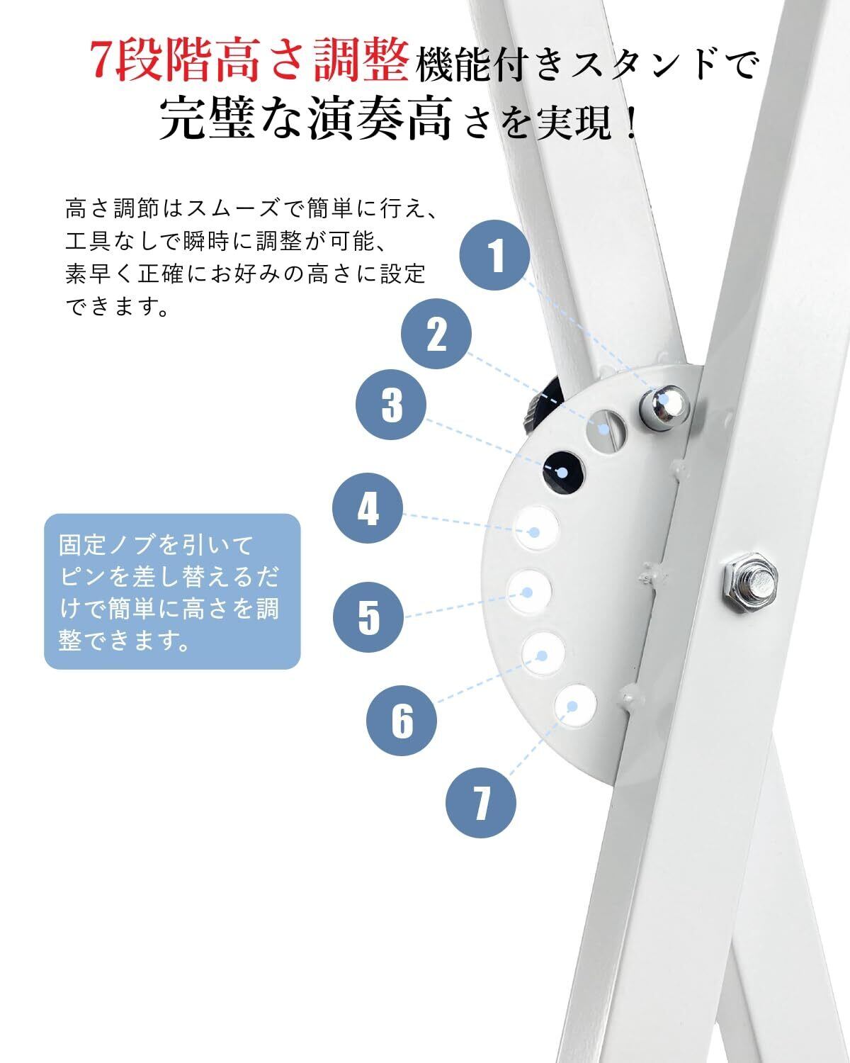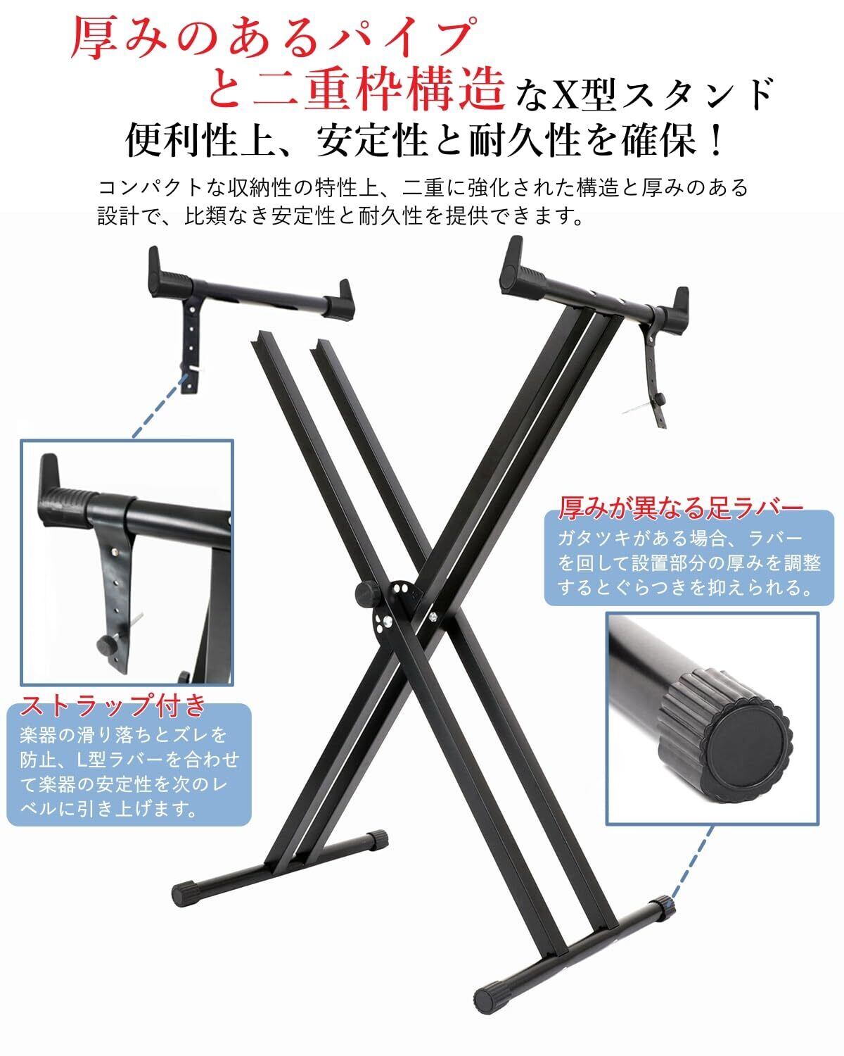 【キーボートスタンド】厚みのある金属製の二重X型構造で、収納のしやすさと安定性を両立。収納スペースが限られる方に最適です。7段階の高さ調節機能で、身長や座り方を合わせて理想的な演奏高さに調整できます。異なる厚みの足ラバーを使用し、ガタつきがある場合はラバーを回して調整すればぐらつきを抑えられます。滑り落ちるのを防ぐストラップ(固定孔のある楽器に対応)も付きます。