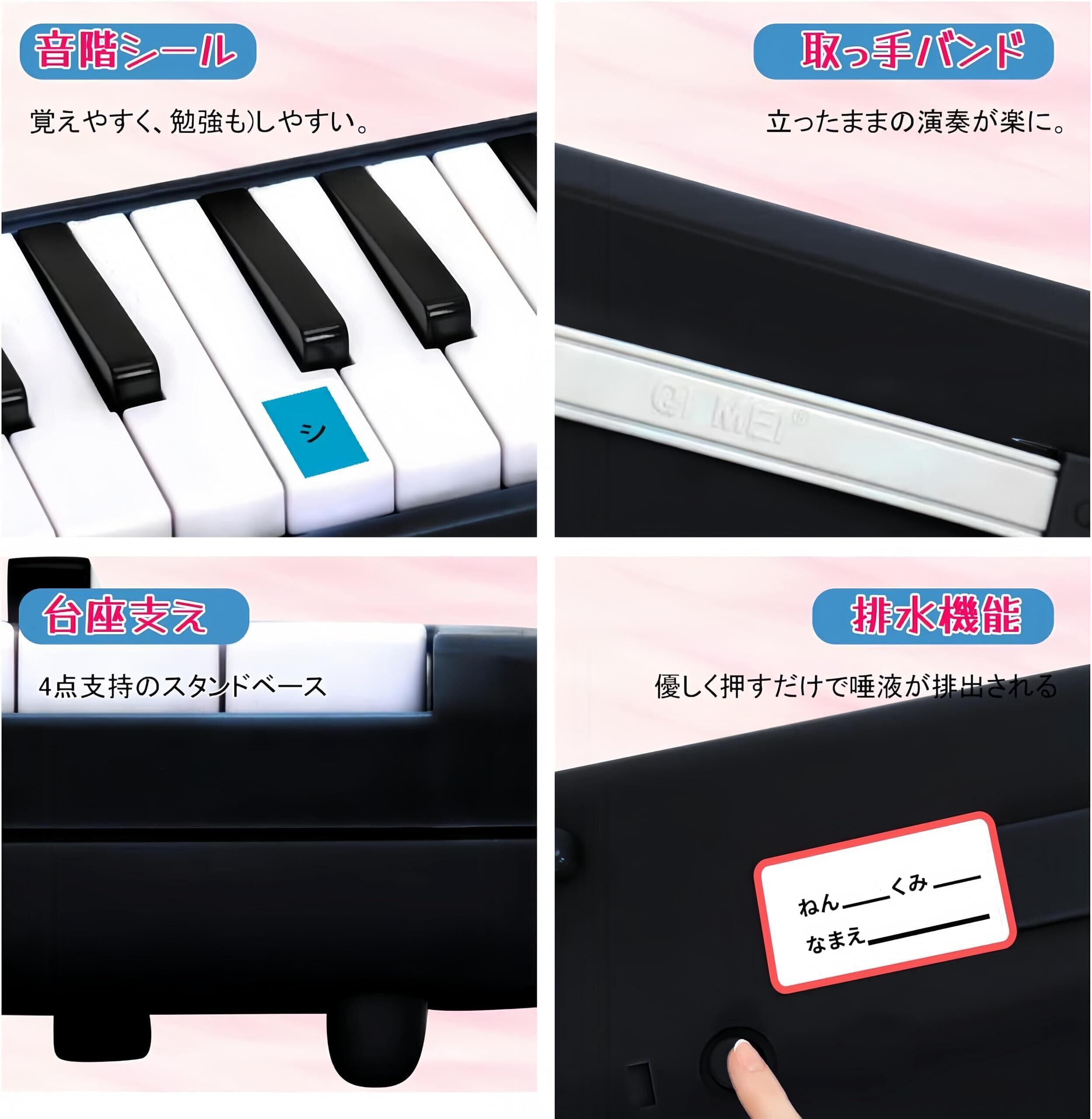 「3種類のシール付き」ドレミ表記シール・クロス・お名前シール・ホースと吹き口シール付き。鍵盤ハーモニカの学習が楽になるだけでなく、鍵盤ハーモニカやホース、吹き口の取り違えによる細菌感染も予防する。