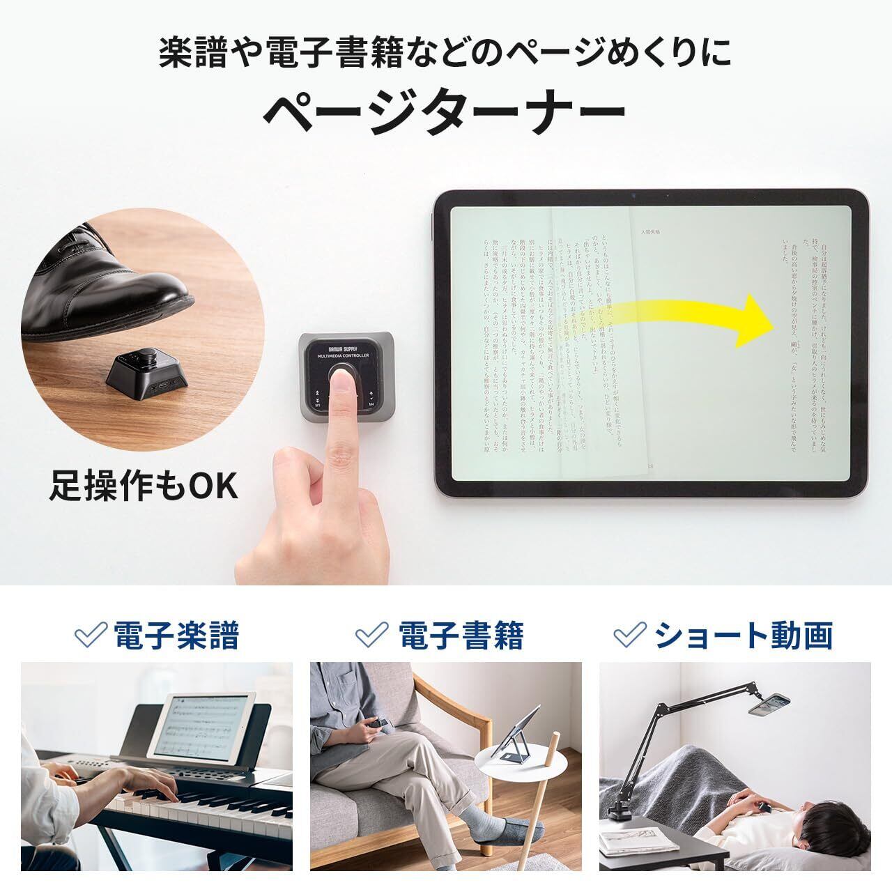 【ページターナーとしても使える2WAY仕様】 プログラマブル ボタン としても、楽譜ページめくり用ページターナーとしても使えるマルチメディアコントローラー。Android/iOS ページ送り にも対応しています。ページターナーとして使う場合は専用ソフトの割り当て画面にて、Androidページ送り、iOSページ送りを選択してください。