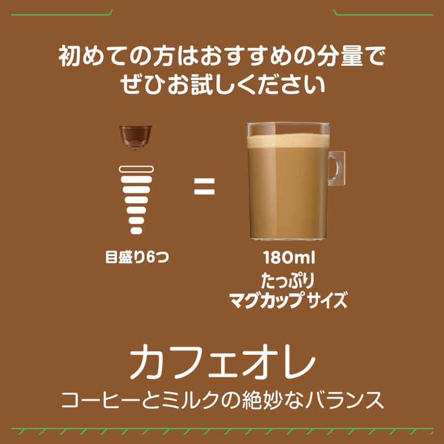 ミルクの自然な甘みもコーヒーのコクも味わえるノンスイートの本格カフェオレ。毎日の朝食の1杯にどうぞ。 【たっぷりマグカップサイズ】おすすめの抽出量は180mlなので、マグカップサイズにピッタリ。たっぷりゴクゴクとお楽しみいただけますので、一日のはじまりである朝食時にもピッタリです。【本格的な味わい】ミルクの自然な甘さと、コーヒーのコクの絶妙なバランス。【ノンスイート】砂糖不使用のノンスイートで、ミルク由来の自然な甘さが感じられ、毎日飽きずにお楽しみいただける味わいに仕上がっています。【1カプセルで簡単、便利】コーヒーとミルクのパウダーが1つのカプセルに密封されているので、一度の抽出で簡単に抽出することができます。忙しい1日の始まりにも、気軽にお飲みいただけます。【おすすめの抽出量:初めての方はおすすめの分量でぜひお試しください】180ml(オートストップ型のマシンをご使用の場合、目盛り6つ) 原材料・成分 乳等を主要原料とする食品(生乳)、コーヒー、pH調整剤、乳化剤(大豆由来) 安全警告 カプセルはネスカフェ ドルチェ グスト システム専用です。一度カプセルホルダーにセットして針穴が開いたカプセルは使用しないでください(お湯の噴出によるやけどのおそれ)。引用者が乳アレルギーの場合、ご使用前にカプセルホルダーを流水で十分すすぎ、抽出口付近を針に十分注意した上で清掃してください。本体のインジケーターもしくは電源スイッチの点滅中は、カプセルホルダーの操作をしないでください(けが、やけどのおそれ)。